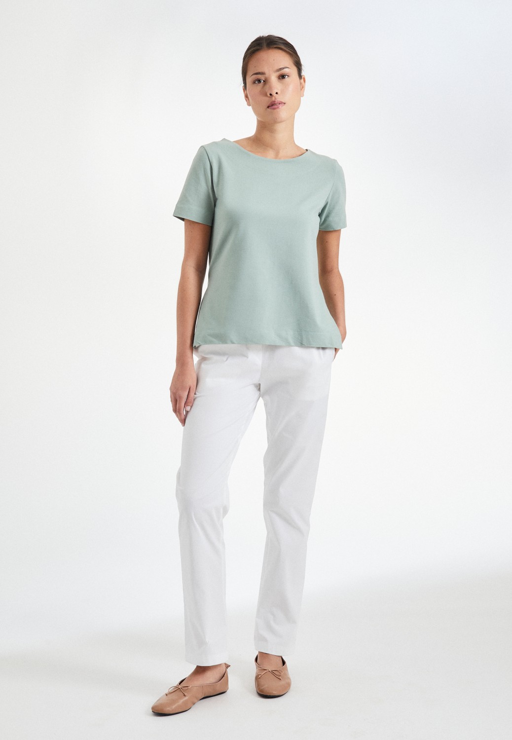 - Rundhalsausschnitt mit breitem Beleg