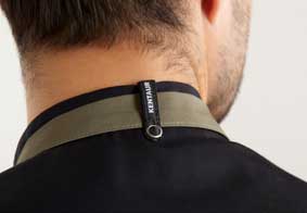 - Lasche außen am Kragen zum Fixieren des Nackenbandes der Latzschürze