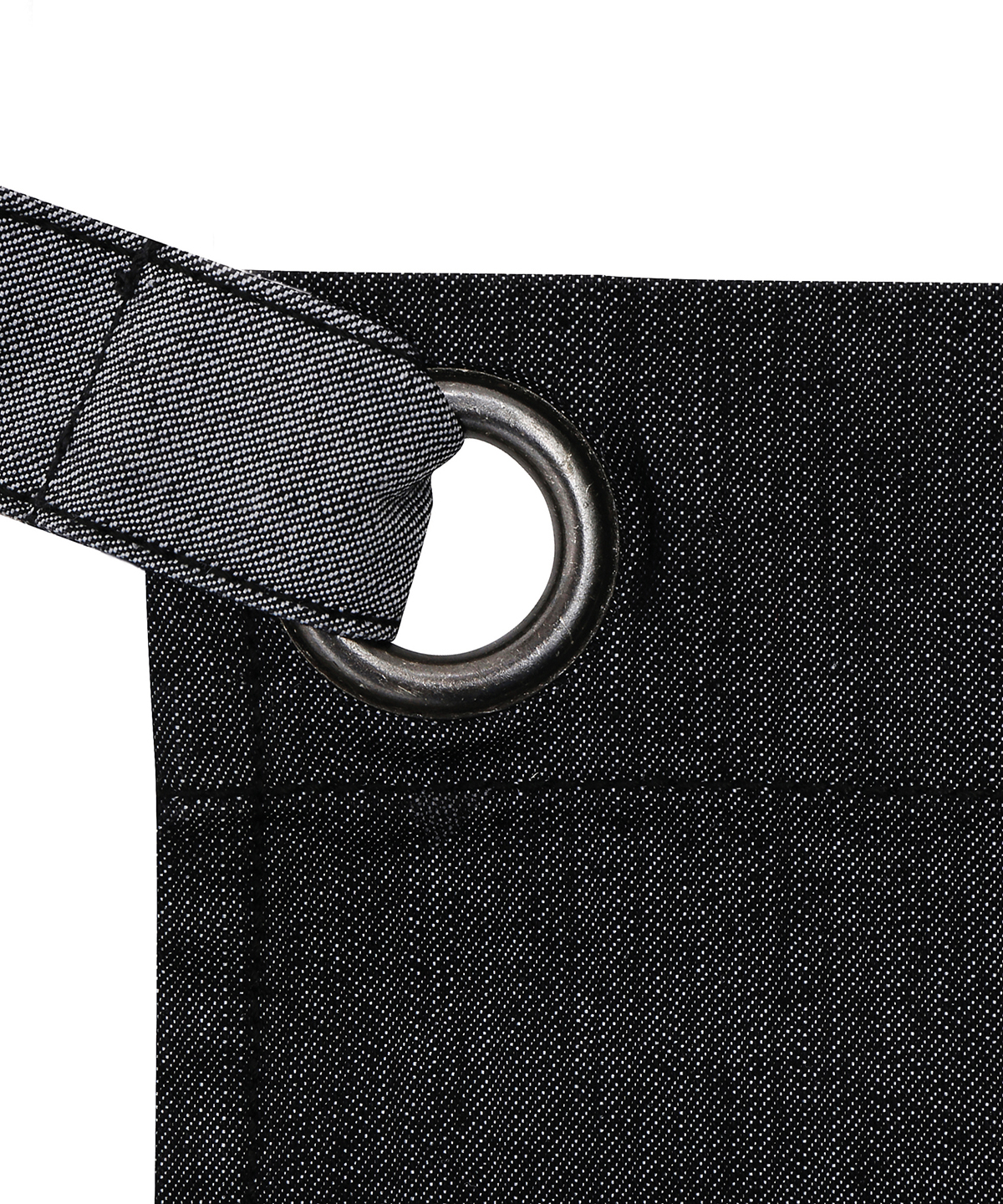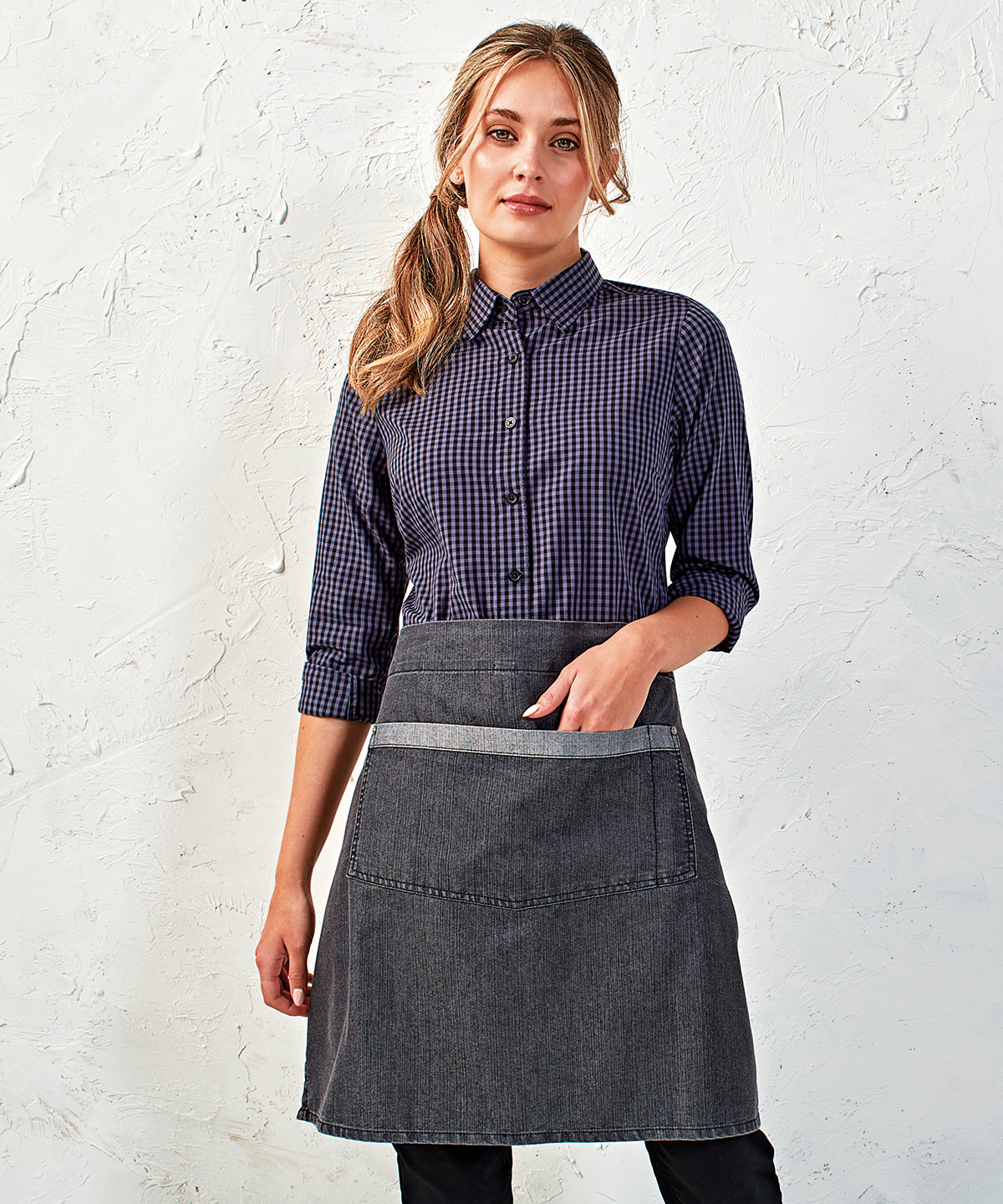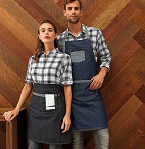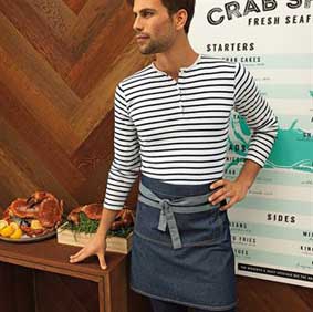 • eine mittellange Denim-Bistroschürze mit zwei großen Metallösen zum Befestigen der Bindebänder