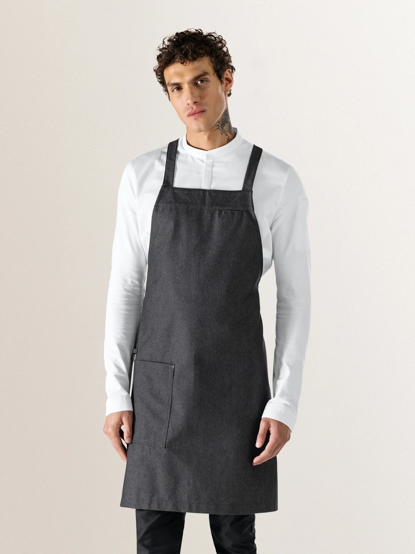 •  Die robuste Latzschürze Eden  aus Heavy Denim mit gekreuzten Trägern am Rücken bietet optimalen Tragekomfort.